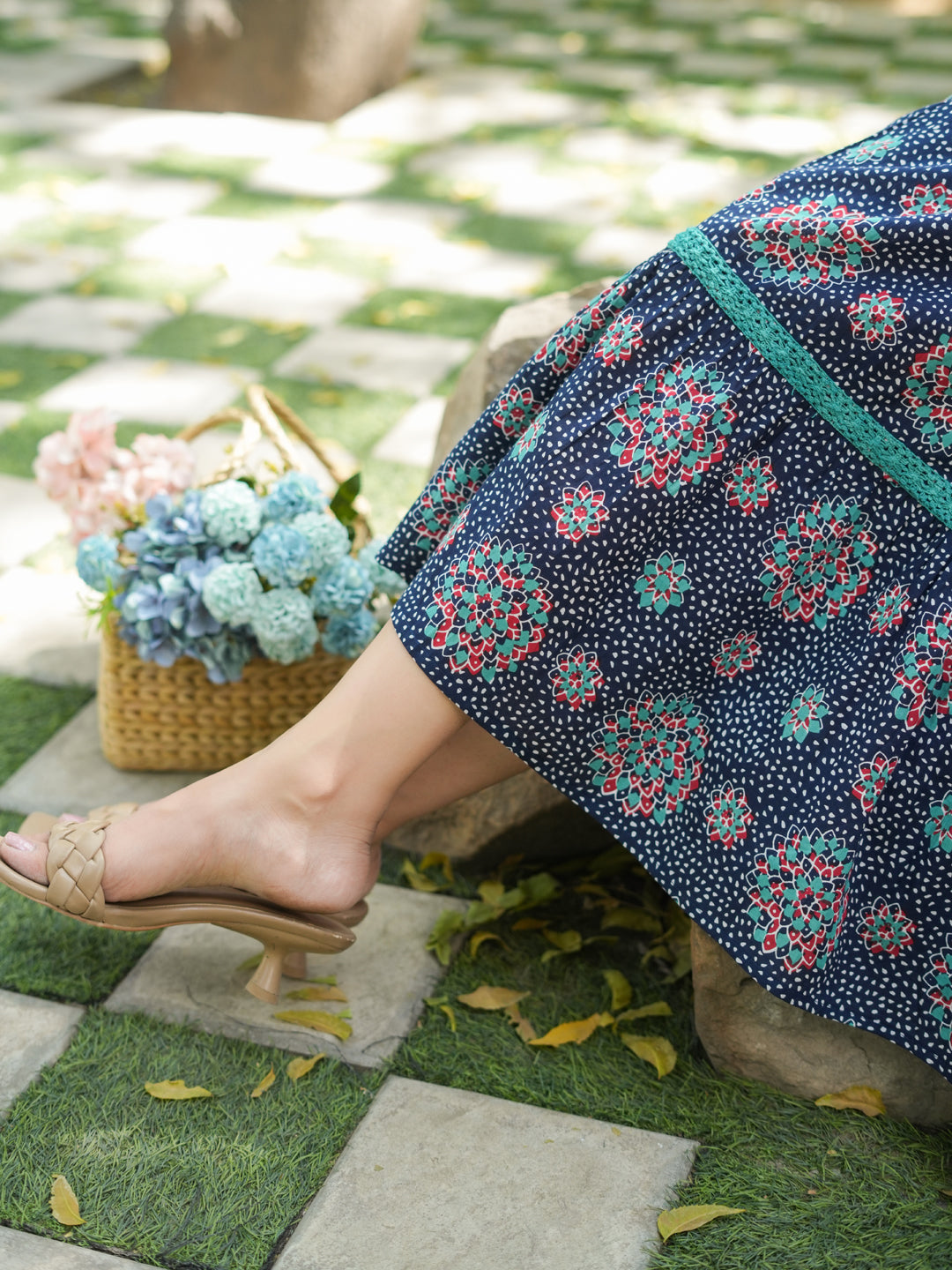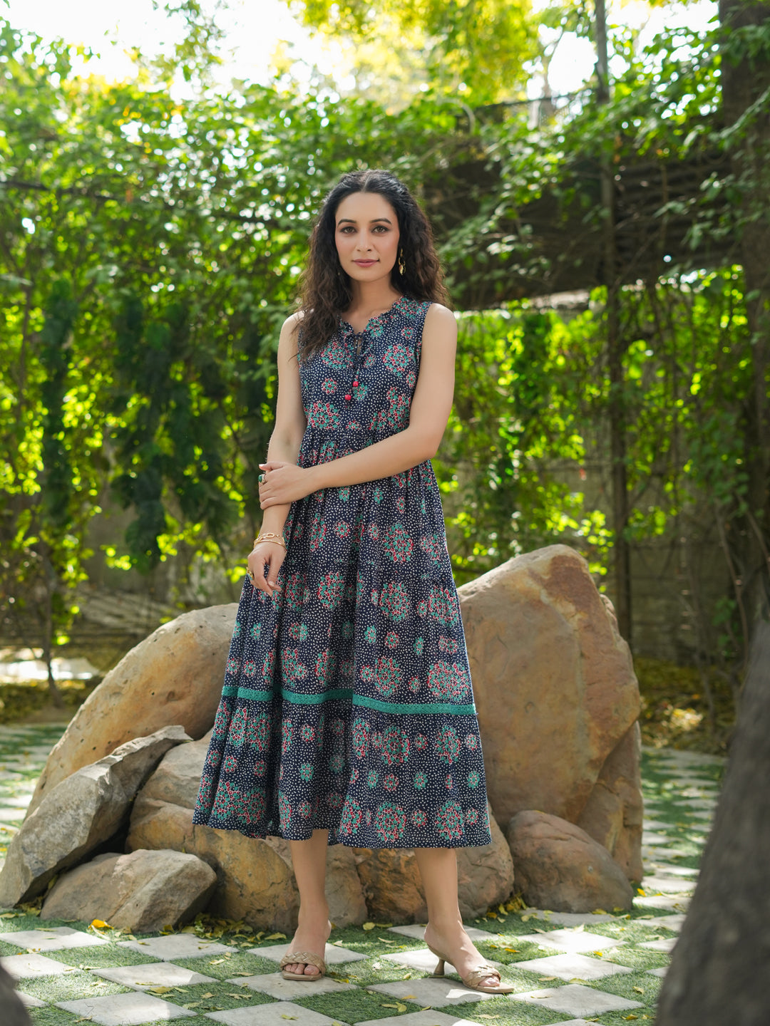 This is a navy blue ethnic printed fit and flare dress, tie-up neck dress, sleeveless midi length dress with flared hem.