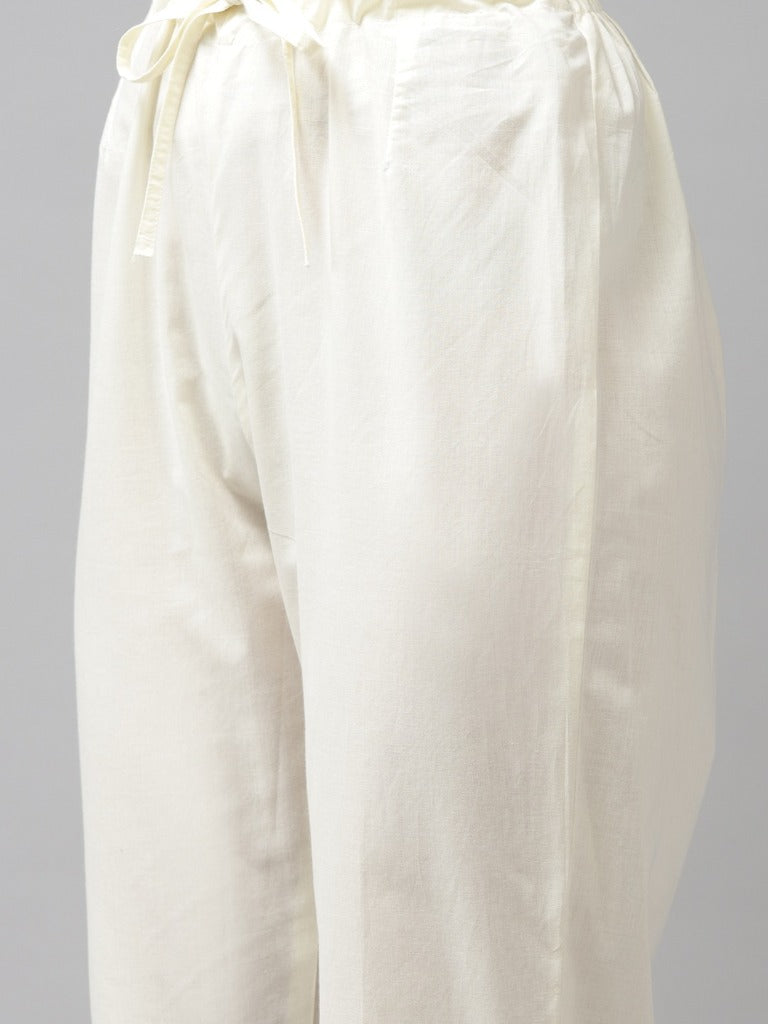 Cream and blue ethnic motifs printed anarkali kurta, round neck three quarter regular sleeves with gotta patti and sequinned detail, calf length with flared hem, solid trousers with drawstring closure