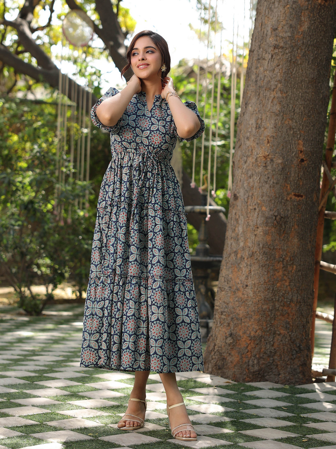 Women Rust And Blue Floral Ethnic A-line Pure Cotton Midi Ethnic Dress, Mandarian Collar, Short puff Sleeve, Midi Length in Flared Hem